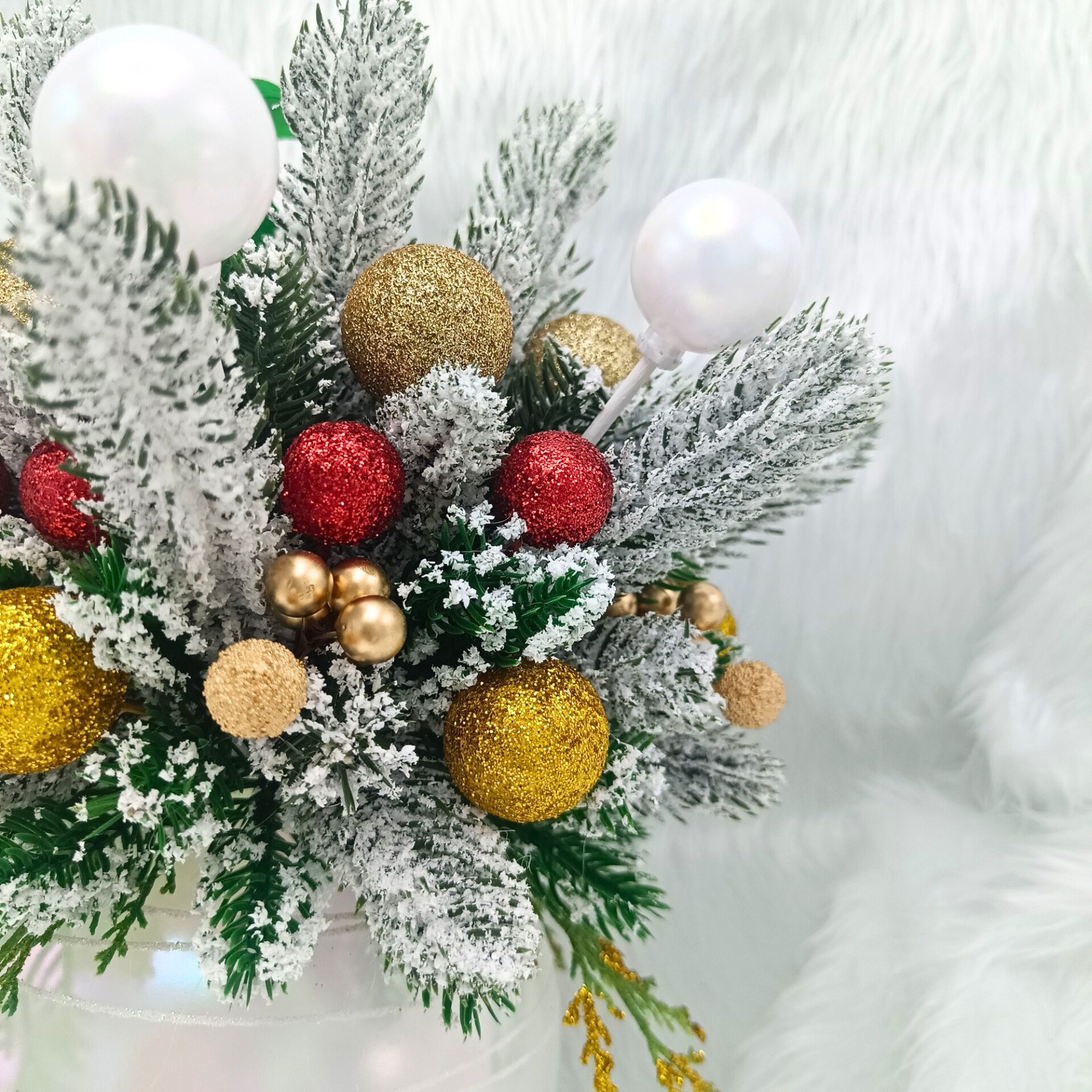 „Eleganță de Iarnă” este un buchet decorativ cu aer festiv, creat pentru cei care iubesc atmosfera clasică și caldă a Crăciunului. Bradul acoperit cu fulgi ușori dă senzația unei ierni liniștite, iar globurile auriu-sclipitoare aduc strălucire și lux. Globurile sunt lucrate manual, unele pictate cu acrilice și apoi acoperite cu glitter, pentru un efect delicat, dar puternic în lumină.