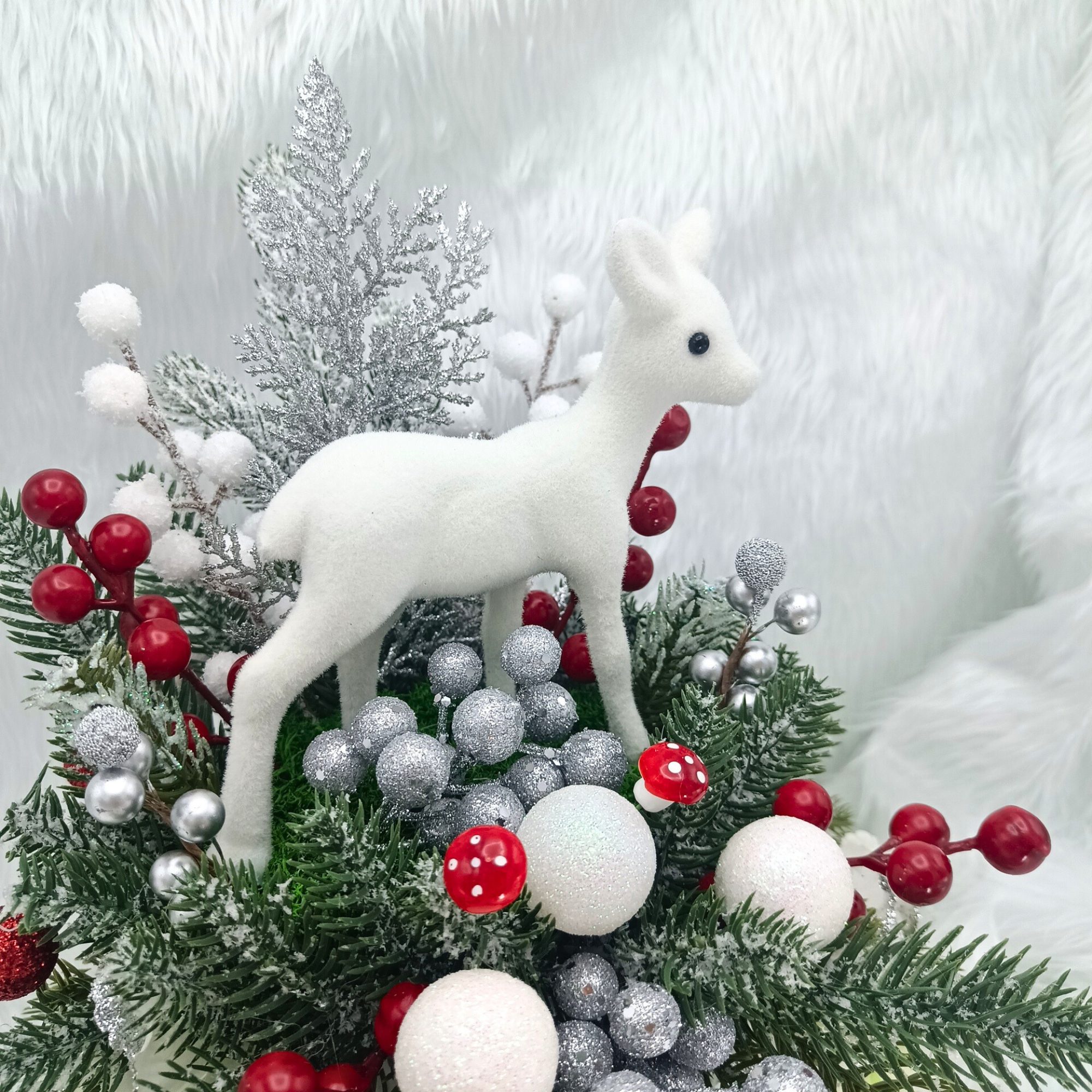 Un aranjament elegant de iarnă, cu o căprioară albă ce pare desprinsă dintr-o poveste.