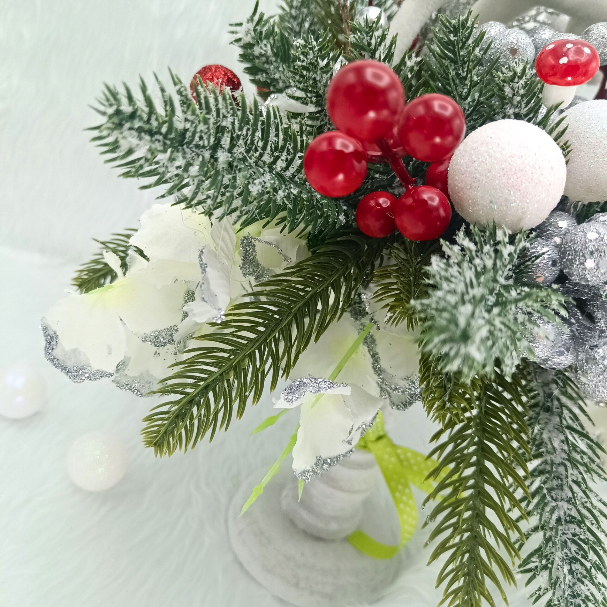Aranjamentul “Pădurea cu Zăpadă” surprinde magia liniștită a iernii: ramuri verzi acoperite discret cu zăpadă, fructe roșii ruginii și accente argintii care strălucesc ca înghețul în lumina dimineții. În centrul compoziției tronează o căprioară albă, delicată și blândă, ca o amintire a pădurilor tăcute în ajun de Crăciun.